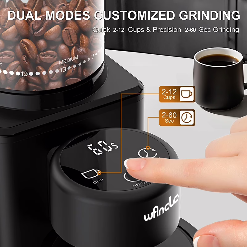 Brew coffee exactly the way you love it with the Wancle Electric Conical Burr Coffee Grinder, engineered for precision, consistency, and convenience. Featuring 25 adjustable grind settings, an intuitive touchscreen interface, and dual grinding modes, this smart grinder lets you effortlessly customize your grind — from coarse French press to ultra-fine espresso.