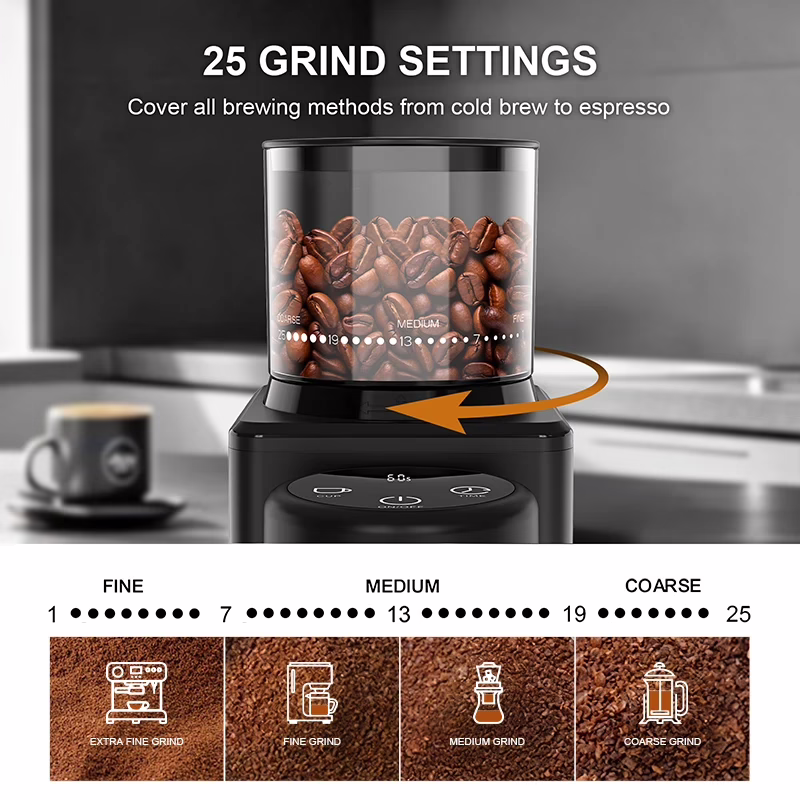 With multiple intuitive grind settings available, it caters to everything from espresso to French press grinds.