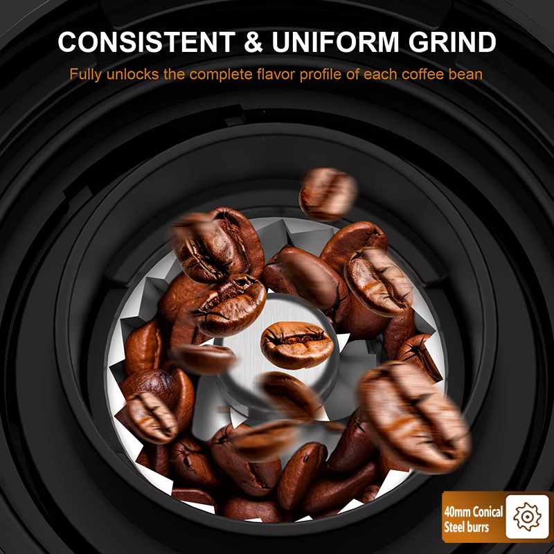 With stainless steel precision burrs, every grind is smooth, uniform, and flavor-rich. The advanced residue-free design ensures a clean, waste-free operation, delivering pure coffee flavor cup after cup.
